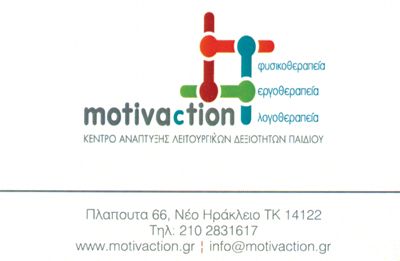 Το Κέντρο Ανάπτυξης Λειτουργικών Δεξιοτήτων Παιδιού “Motivaction”,είναι ένα σύγχρονο θεραπευτικό κέντρο για παιδιά με διαφόρωνειδών κινητικές και αναπτυξιακές δυσκολίες.